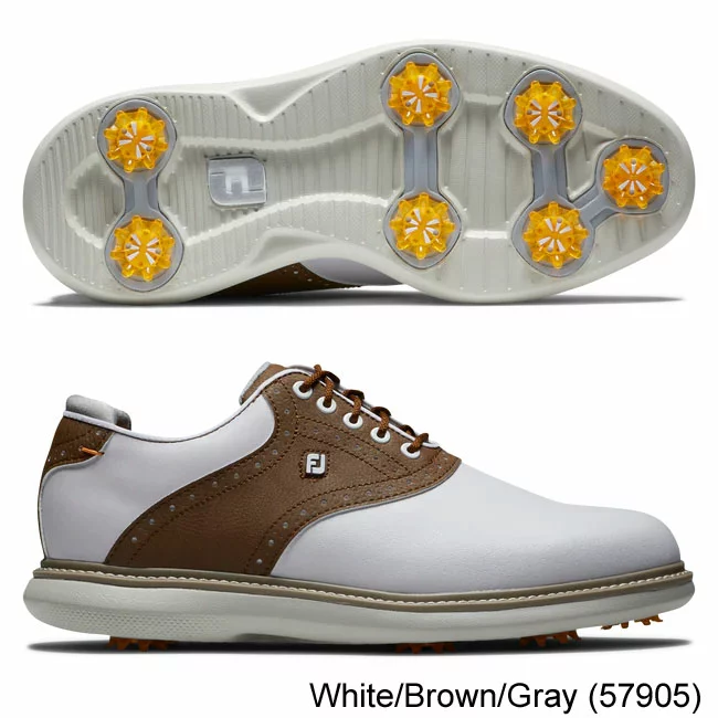 FootJoy Traditions Golf Shoes feature classic style and a traditional, timeless look with a modern lightweight ride. The shoe’s super-cushioned foam underfood and no-slip achilles pad provide all day comfort so you can walk the course with ease. On the sole, Pulsar LP cleats deliver substantial traction from a variety of lies.