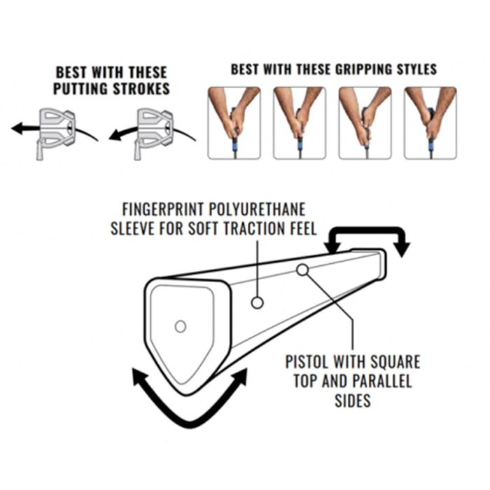 Tour size novel shape design to assist keeping the putter face square at impact and the hands in a comfortable position on the grip the SINKFIT Square Top Poly integrates a subtle pistol shape underside, parallel sides and square top to enhance “down-the-line” stroke control . The polyurethane sleeve design over lightweight under-listing and optimized surface traction deliver a feels as good as the grip performs. Great for players with an arc-to-straight putting stroke.