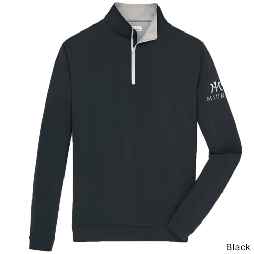 This Peter Millar Perth quarter-zip is made from a signature high-tech loop terry fabric that offers four-way stretch, two-yarn moisture-wicking for quickly drying, UPF 50+ sun protection and easy-care. Styled with a print zipper, mock collar, banded cuffs and hem. Available in Navy or Black with the signature Miura logo on the sleeve.