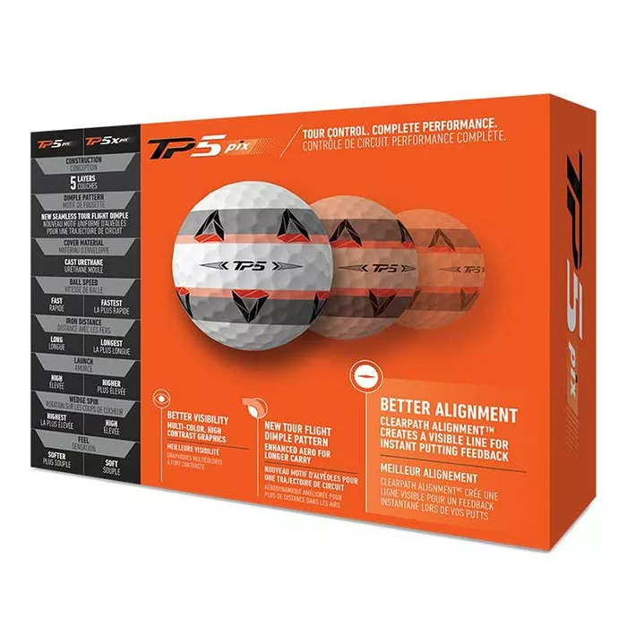 | TP5x pix | 5 LAYERS | NEW SEAMLESS TOUR FLIGHT DIMPLE | SOFT-TOUGH CAST URETHANE | FASTER | LONGEST | HIGHER | HIGH | SOFT |